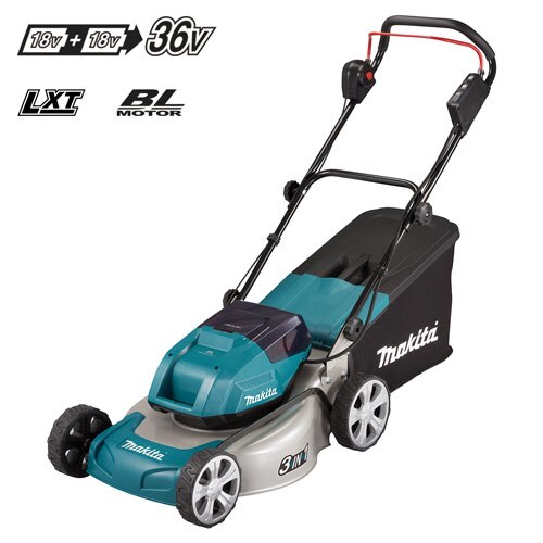 Features - 18V X2 (36V) LXT BL Brushless Cordless 46 cm (18") 3-in-1 Mower - 800 m² Large Mowing Area - Soft no load automatically reduces the motor speed according to load condition for low noise - Quiet mode provides rotation speed (2,500 RPM) by constant speed control - Wide 46 cm (18") robust steel cutting deck for increased durability - IPX4 water resistant for use in bad weather - 10 cutting heights ranging from 20 mm (13/16") to 75 mm (2-15/16") to manicure the lawn to your specifications - Dual battery fuel gauge located near operator's hand indicates the power remaining in each battery individually in 3 stages - The remaining battery capacity can be easily checked on the battery fuel gauge during operation - Easy-to-push design handle with rubberized soft grip - Two 18V LXT Li-Ion batteries deliver the power and run time for corded demands without leaving the 18V LXT platform - Large capacity grass basket reduces the need for emptying - Foldable for easy storage when not in use - Constant speed control maintains constant speed under load - Electronic current limiter helps protect the motor from overload - 3 in 1 (Lawn mowing / Grass collecting / Mulching) - 2-tooth blade for both cutting and mulching - Soft start feature gradually increases speed to eliminate start up shock - Single-lever cutting height adjustment - Built-in ball bearing on axles for increased durability. Child lock key is provided for increased safety. Low noise level suitable for use in residential areas and public spaces. Zero emissions and reduced maintenance; no need for gas or oil. Instant start-up; simply load two 18V LXT batteries and the lawn mower is ready to use. The best choices for use in resorts, public places and residential areas. Battery protection circuit protects against overloading, over-discharging and over-heating - Include: 1 x Rapid charger dual port, 2 x 18v 5.0Ah Batteries, 1 x Makpac. Technical Specification Blade type - 2 Tooth No load speed (RPM) - 2,500 - 3,300 Hole diameter - 10.0 mm (3/8") Cutting width - 460 mm (18") Cutting height - 20 - 75 mm (13/16" - 2-5/16") Recommended mowing area - w/ BL1860B x2: 800 - 1,600 m² w/ BL1850B x2: 680 - 1,360 m² w/ BL1840B x2: 550 - 1,100 m² w/ BL1830B x2: 380 - 760 m² w/ BL1820B x2: 290 - 580 m² w/ BL1815N x2: 210 - 420 m² Continuous use (minutes) - w/ BL1860B / BL1850B/ BL1840B / BL1830B / BL1820B / BL1815N: 21 / 18 / 14 / 10 / 8 / 6 Sound power level - 91 dB(A) Sound pressure level - 79 dB(A) Vibration level - 2.5 m/s² or less Dimensions (L x W x H) - During operation: input error When stored (w/o grass box): input error Net Weight - 25.3 - 27.6 kg (55.8 - 60.8 lbs.) Manufacturer's warranty - 6 months (T & C apply) We are authorised service centre for MAKITA Power Tools Tel : 022-23736027 For sales : + 918017265815, sale@fairtradecorp.in